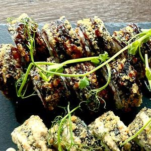 Заказать Рис, нори, курица, сыр сливочный, перец, панировка, соус унаги.