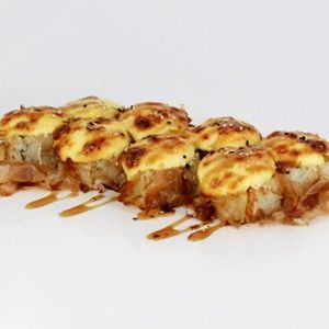 Заказать Рис, нори, сливочный сыр, огурец, крабовая смесь, икра масаго, сырная шапочка, соус унаги.