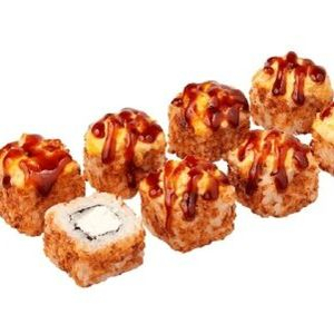Заказать Рис, нори, сливочный сыр, лосось, огурец, лук фри, сырная шапочка, соус унаги.