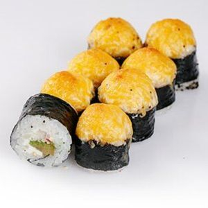 Заказать Рис, нори, креветка, сырная шапочка, соус унаги.