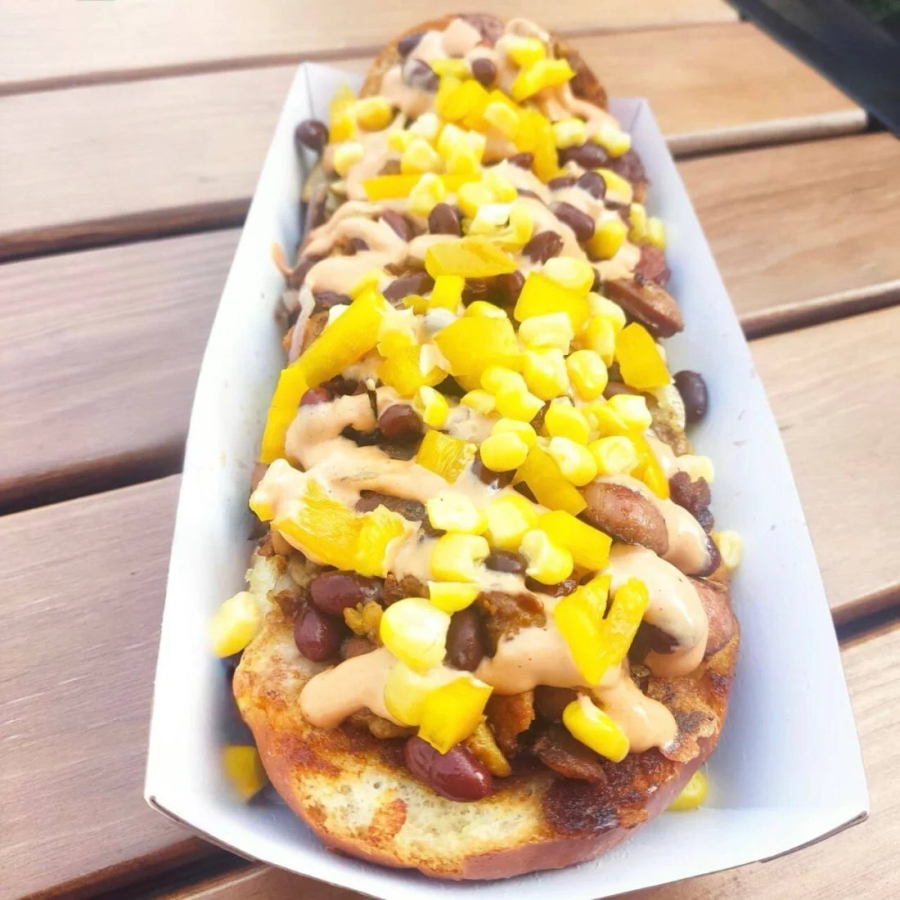 Мясо курица, сыр Моцарелла, лук, огурец маринованный, фасоль консервированная, морковь по-корейски, томатный соус, соус «Чесночный», луковые чипсы.