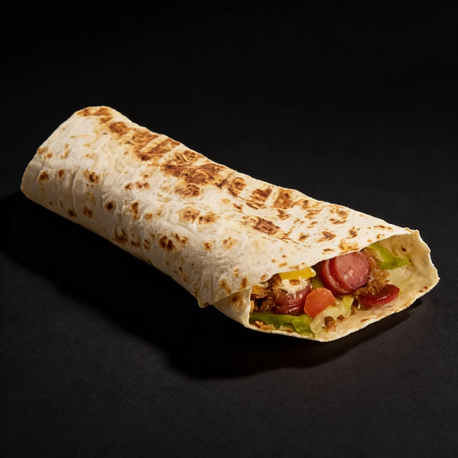 Лаваш, колбаска в/к, сыр, огурец маринованный, соус сырный.