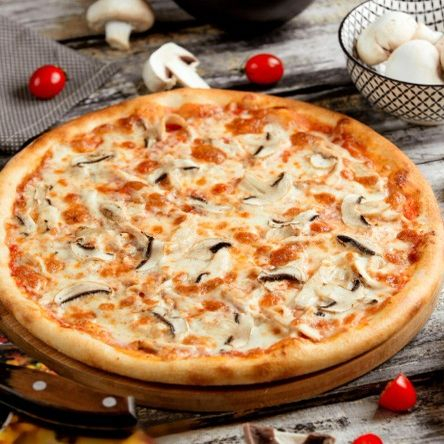 Тесто, соус, сыр, курица, сыр голландский, томат, шампиньоны жареные, огурец маринованный, перец болгарский, соус гриль.