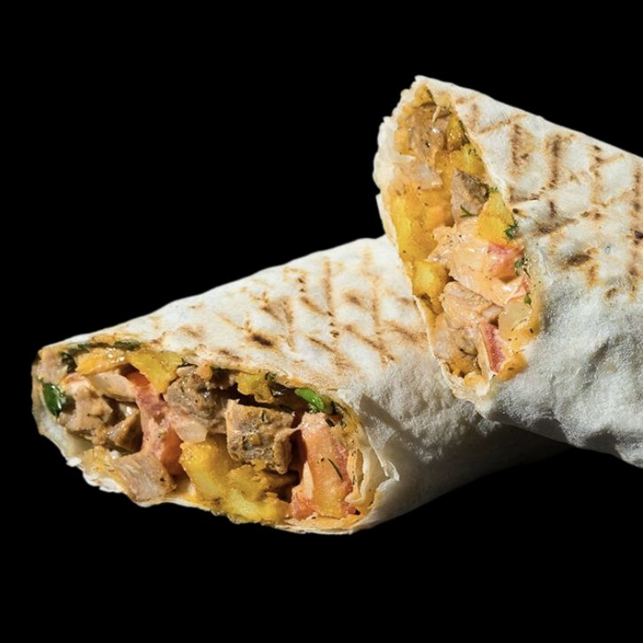 Заказать Внутри сочные, ароматные кусочки мясо, медленно обжаренная до совершенства истощающий пикантный аромат. Сочетание и свежесть хрустящий капусты, маринованной морковки и маринованного лука, нежные и свежие овощи (огурцы, помидоры, болгарский перец, зелень), твердый-сливочный сыр, сдобренные чесночным соусом, который связывает все воедино.