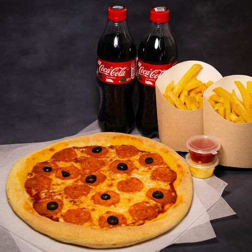 Пицца Пепперони 530г, картофель фри 100г 2шт, кетчуп 2шт, напиток на выбор 0.5л 2шт.