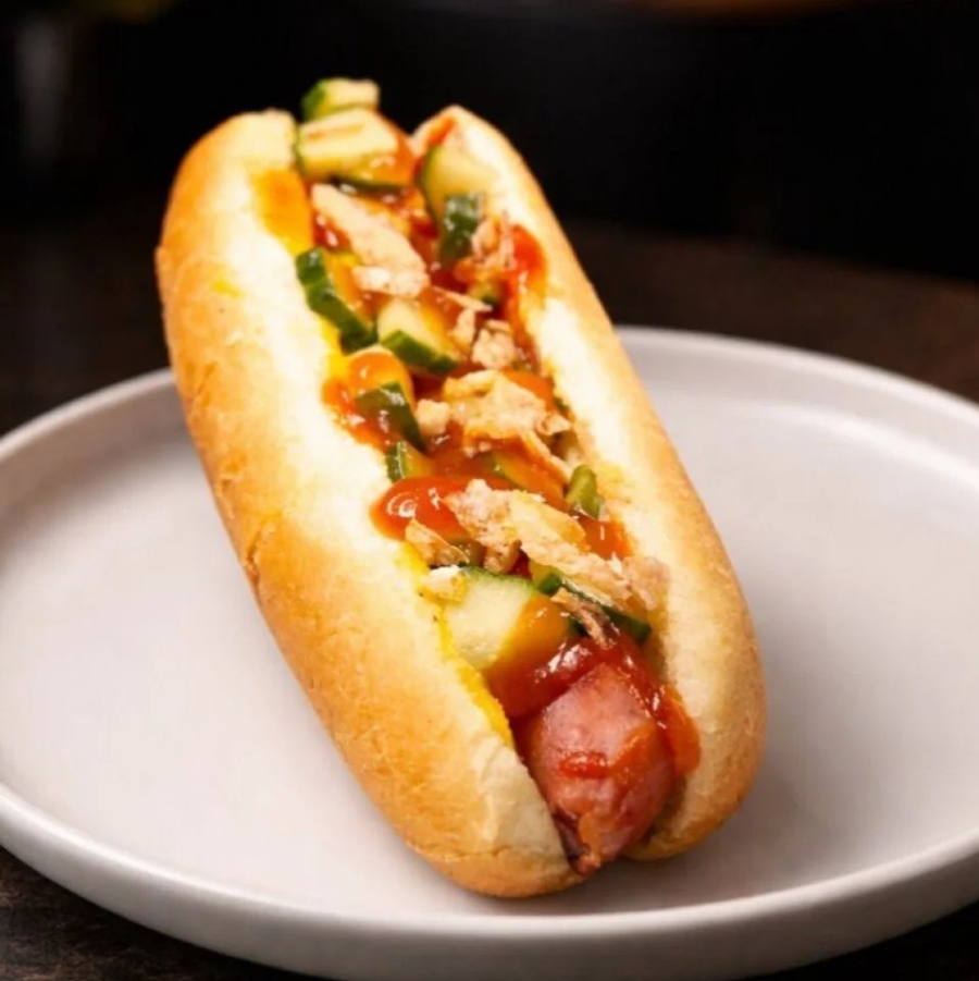 Булочка, говяжья колбаска, кетчуп, майонез, горчица, морковь По-корейски, солёный огурец.
