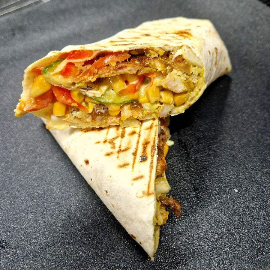 Лаваш, курочка гриль, пекинская капуста, кукуруза, томат, огурец свежий, перец болгарский, соус горчично-чесночный.