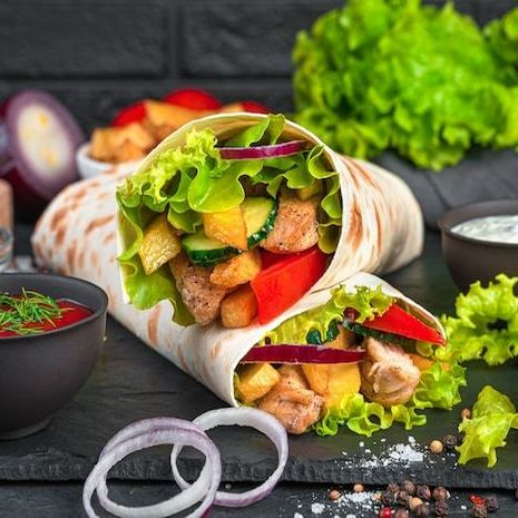 Курица, микс салатов, огурец с/с, томат, чесночный соус, халапеньо, соус острый.