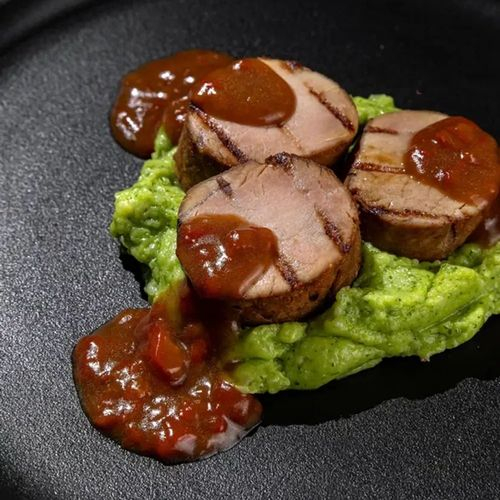Свинина, пюре, соус al forno на печёном перце.