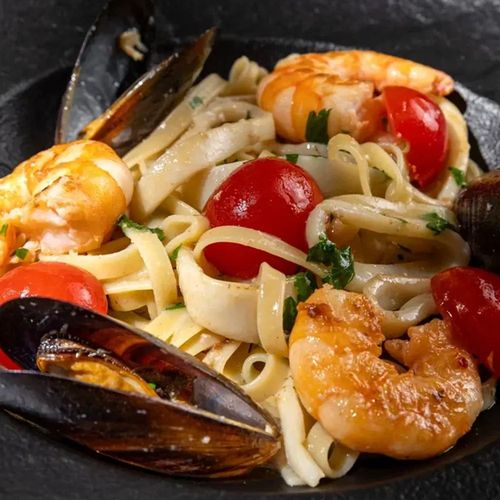 Тальятелле, креветки, мидии двустворчатые, кальмар, вино белое, томаты черри, чили.
