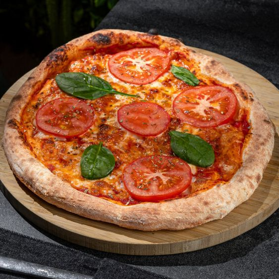 Томатный соус, моцарелла, помидоры Черри, соус Песто.