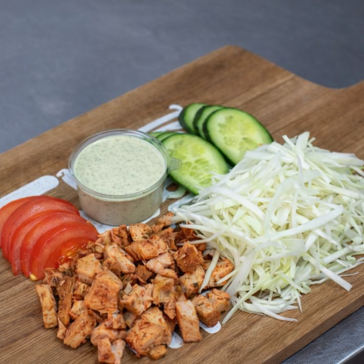 Капуста, огурец, помидор, соус Фирменный, курица.