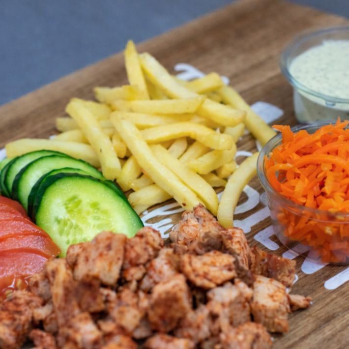 Картофель, курица, морковь пряная, огурец, помидор, соус Фирменный.