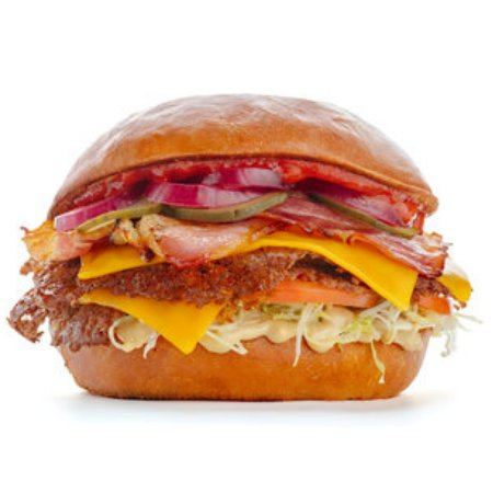 Булочка картофельная, говядина, чеддер, айсберг, томат, огурец маринованный, бекон, лук красный маринованный, соус чесночный, кетчуп.