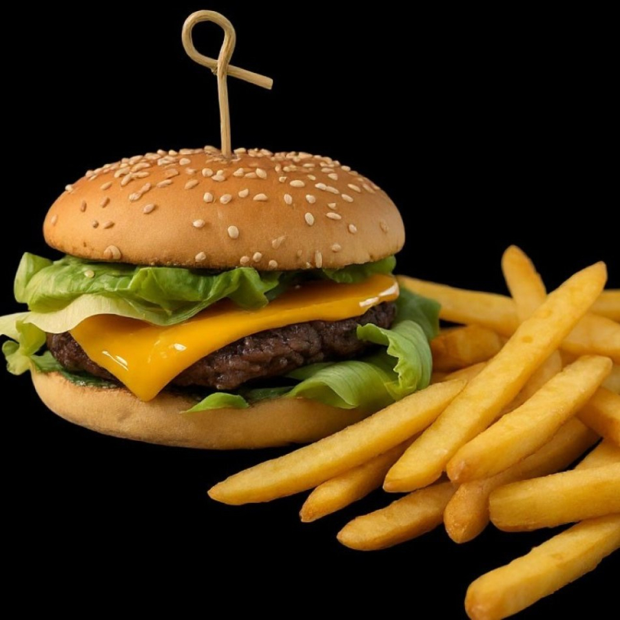 Булочка с кунжутом, соус барбекю, салат айсберг, говяжья котлета, сыр Чеддер, помидор, лук маринованный, огурец маринованный, картофель фри.