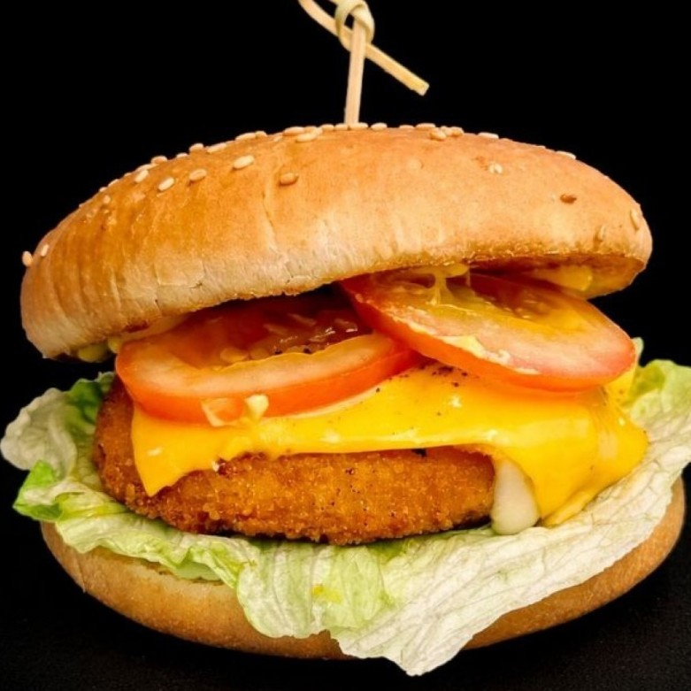 Булочка с кунжутом, соус песто, соус сырный, сырная котлета, сыр чеддер, томаты.