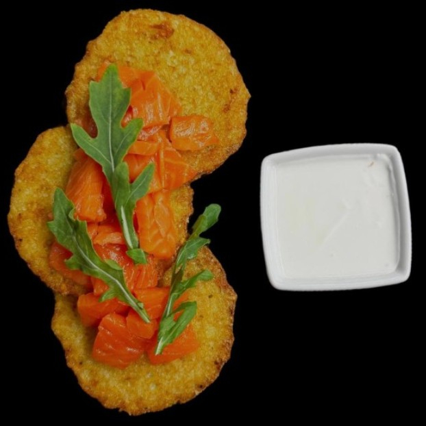 Драники, филе цыпленка, шампиньоны, сливочный соус, лук пассерованный, сметана.