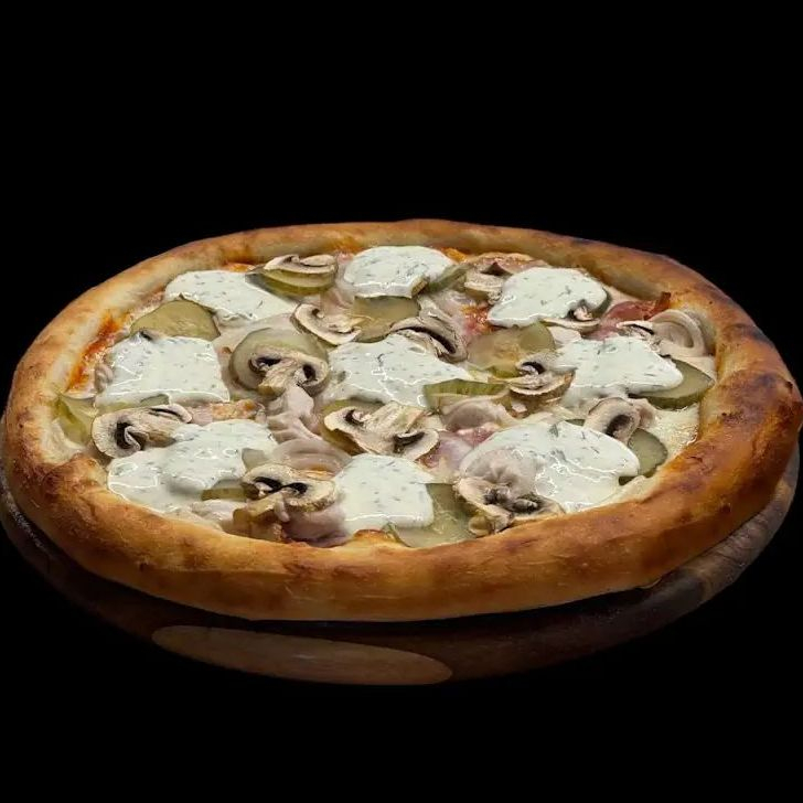 Заказать Соус для пиццы, филе цыплёнка, бекон, огурец маринованный, лук, шампиньоны, соус сметанный.