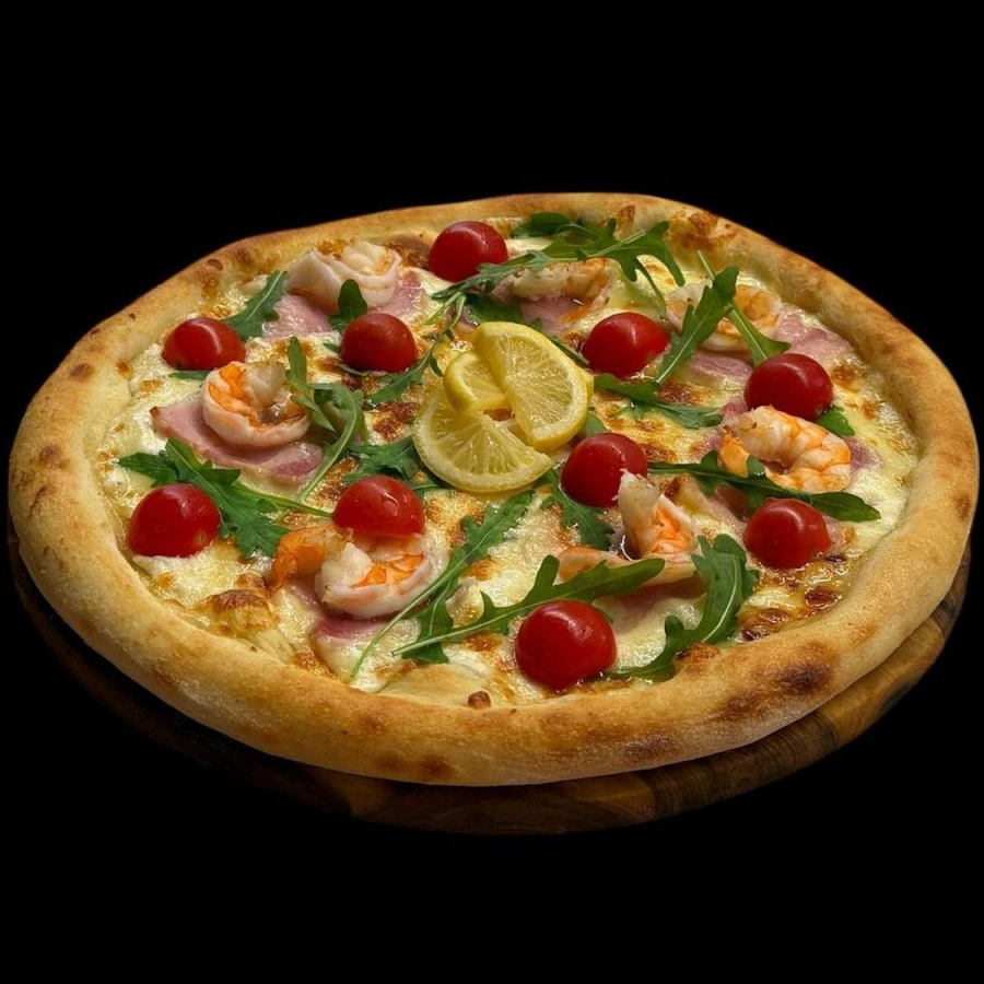 Соус чесночный, Моцарелла, бекон, креветка королевская, томат Черри, лимон.