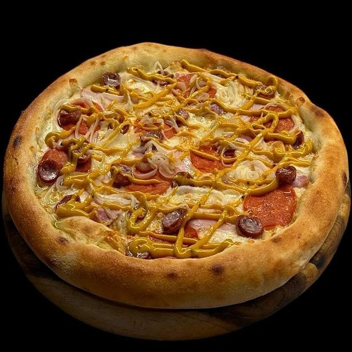 Пепперони, бекон, колбаски охотничьи, лук маринованный, Гриль соус, сыр Моцарелла, горчичный соус.