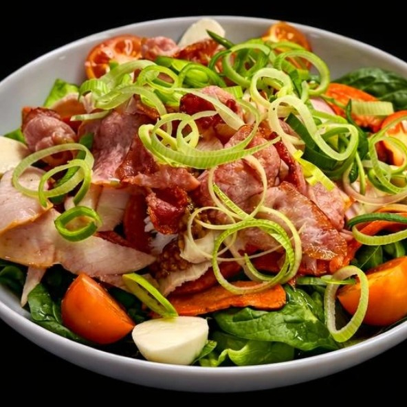 Айсберг, зелень, пепперони, филе куриное, черри, итальянская заправка, моцарелла мини, бекон обжаренный во фритюре, лук порей.