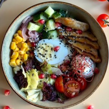 Булгур, цыпленок, ореховый соус, творожный сыр фета, огурец, томат, яйцо, микс салат, маринованный лук, специи.