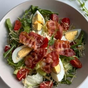 Заказать Салат айсберг, руккола, пармезан, яйцо, черри, гренки, соус цезарь, бекон.