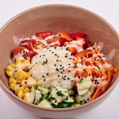 Заказать Рис, огурцы, перец болгарский, морковь корейская, помидоры черри, кукуруза консервированная, соус кунжутный.