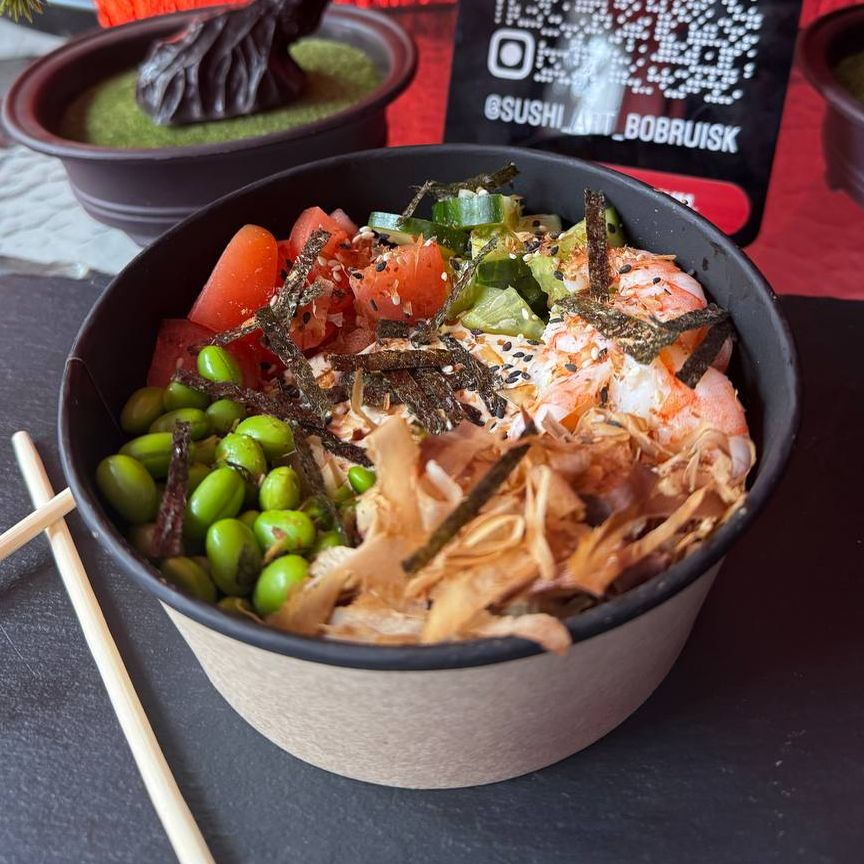 Заказать Рис, креветки, томат, огурец, бобы эдамаме, стружка тунца, фурикаке, соус терияки, соус кунжутно-ореховый.