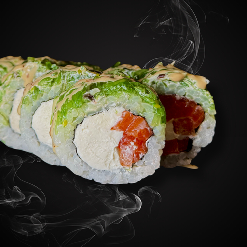 Рис, нори, сыр, огурец, лосось терияки, соус спайси, соус терияки, фри лук.