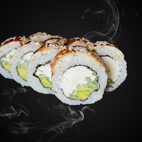 Заказать Рис, сыр, огурец, авокадо, угорь, соус Терияки, кунжут.