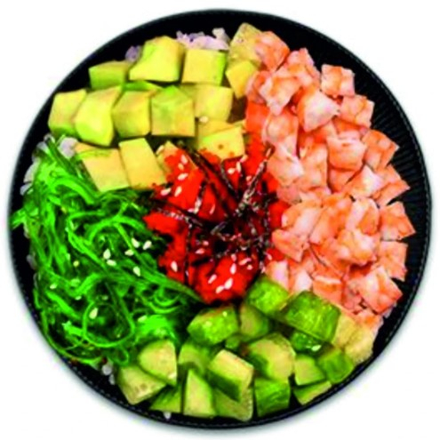 Заказать Рис, курица копченая, авокадо, огурец, икра тобико, чука, соус.