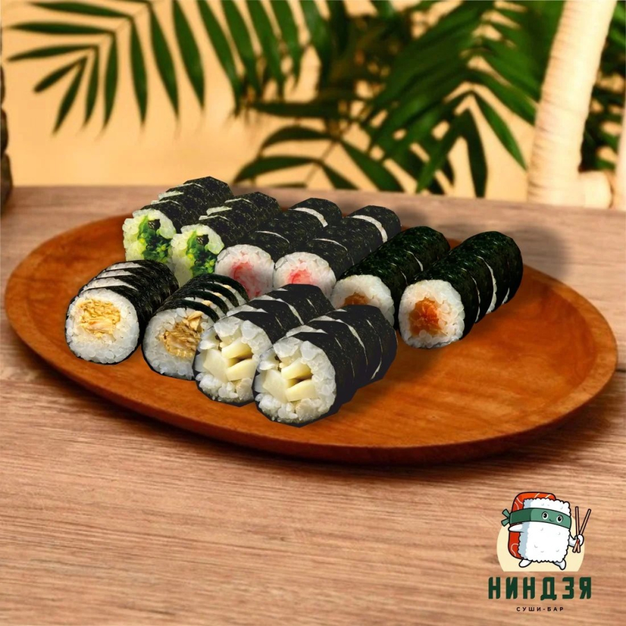 Лайк: Рис, нори, бекон, сыр творожный, огурец, лук кранч, соус терияки - 265 гр. Тигр: Рис, нори, сыр творожный, огурец, креветка, масаго красный - 265 гр. Чикен-хот: Рис, нори, сыр творожный, курица копчёная, авокадо, темпура, сухари - 280 гр. Мантра: Рис, нори, огурец, кальмар, сыр творожный, кунжут, сливочно-чесночный соус, соус терияки - 330 гр. Сердце самурая: Рис, нори, сыр творожный, бекон, помидор, спайси соус, кунжут чёрно-белый - 320 гр.
