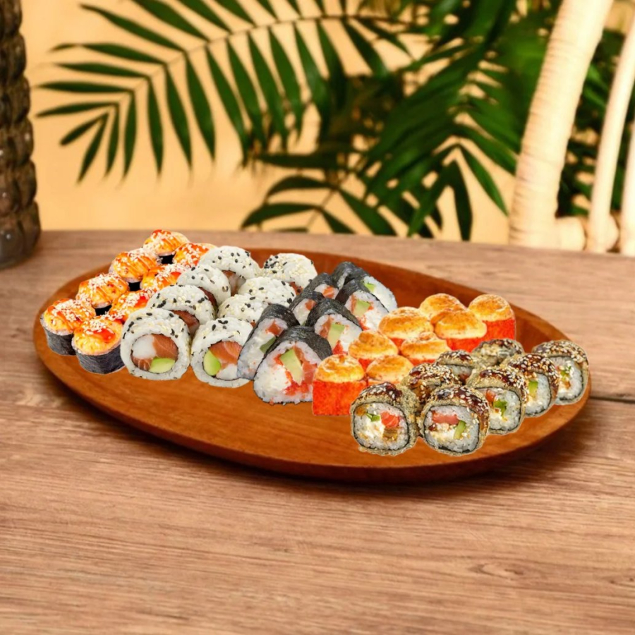 Тигр: Рис, нори, сыр творожный, огурец, креветка, масаго красная-265 гр. Трио: Рис, нори, сыр творожный, салат, тунец, лосось, угорь-270 гр. Сливочный тунец: Рис, нори, сыр творожный, соус терияки, кунжут, ананас, тунец-255 гр. Фараон: Рис, нори, сыр творожный, курица копчёная, краб, сливочно-чесночный соус, кунжут белый, соус терияки, лук фри-335 гр. Ниндзя: Рис, нори, сыр творожный, краб, сливочно-чесночный соус, соус терияки, кунжут чёрно-белый, лук фри-305 гр. Мантра: Рис, нори, огурец, кальмар, сыр творожный, кунжут, сливочно-чесночный соус, соус терияки-330 гр. Мидия хот: Рис, нори, сыр творожный, томат, сухари, мидия, темпура, масаго-290 гр. Туна хот: Рис, нори, сыр творожный, тунец, томат, темпура, сухари-280 гр.