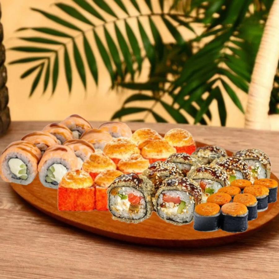 Фараон: Рис, нори, сыр творожный, курица копчёная, краб, сливочно-чесночный соус, кунжут-белый, соус терияки, лук фри - 335 гр. Цунами: Рис, нори, сыр творожный, огурец, сырный соус, кунжут, соус терияки, мидии - 330 гр. Калифорния хот: Рис, нори, краб, сыр творожный, огурец, темпура, сухари - 280 гр. Туна хот: Рис, нори, сыр творожный, тунец, томат, темпура, сухари - 280 гр. Лава с лососем: Рис, нори, сыр творожный, лосось, огурец, нори стружка - 270 гр.