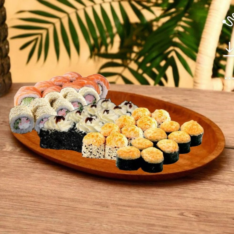 Калифорния с угрем: Рис, нори, сыр творожный, огурец, угорь, масаго черная - 270 гр. Сяке хот: Рис, нори, сыр творожный, лосось, огурец, темпура, сухари - 280 гр. Запеченный с лососем: Рис, нори, сыр творожный, лосось, сырный соус, соус терияки, кунжут белый- 290 гр. Ниндзя: Рис, нори, сыр творожный, краб, сливочно-чесночный соус, соус терияки, кунжут чёрно-белый, лук фри - 305 гр. Сердце самурая: Рис, нори, сыр творожный, бекон, помидор, спайси соус, кунжут чёрно-белый- 320 гр. Фараон: Рис, нори, сыр творожный, курица копчёная, краб, сливочно-чесночный соус, кунжут-белый, соус терияки, лук фри - 335 гр.