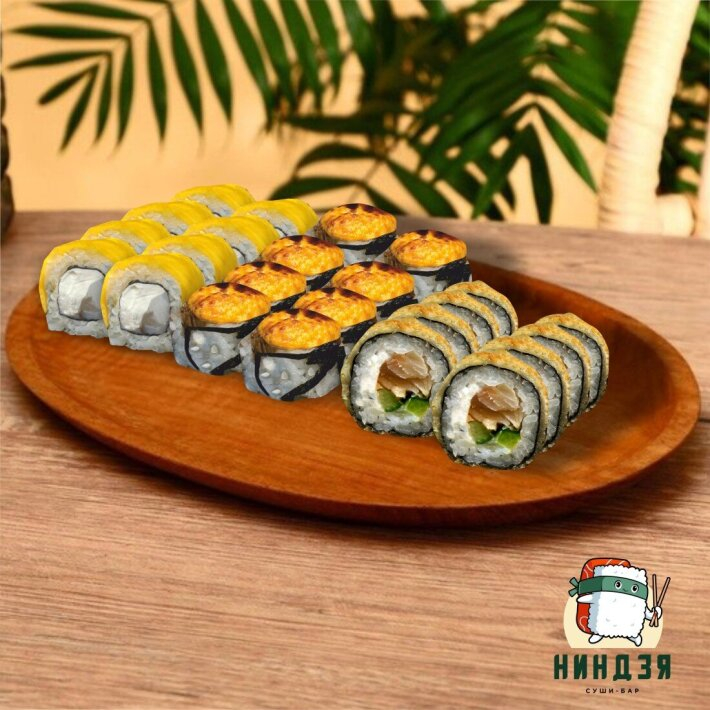 Ролл Мидия хот 8шт.: Рис, нори, сыр творожный, томат, мидия, икра масаго, темпура, сухари панко - 290г; ролл Фараон 8шт.: Рис, нори, сыр творожный, курица копчёная, краб, сливочно-чесночная шапочка, кунжут, терияке, лук кранч - 335г; ролл Запечённый с лососем 8шт.: Рис, нори, сыр творожный, лосось терияке, сырная шапочка, терияке, кунжут - 290г; ролл Гриль тунец 8шт.: Рис, нори, сыр творожный, тунец, томат, сырная шапочка, терияке, кунжут - 320г; ролл Ямайка 8шт.: Рис, нори, сыр творожный, краб, такуан, стружка нори, терияки - 275г; ролл Калифорния с лососем 8шт.: Рис, нори, сыр творожный, огурец, лосось, икра масаго - 270г; ролл Чикен чиз 8шт.: Рис, нори, сыр творожный, салат, курочка копчёная, чеддер, терияки - 270г.