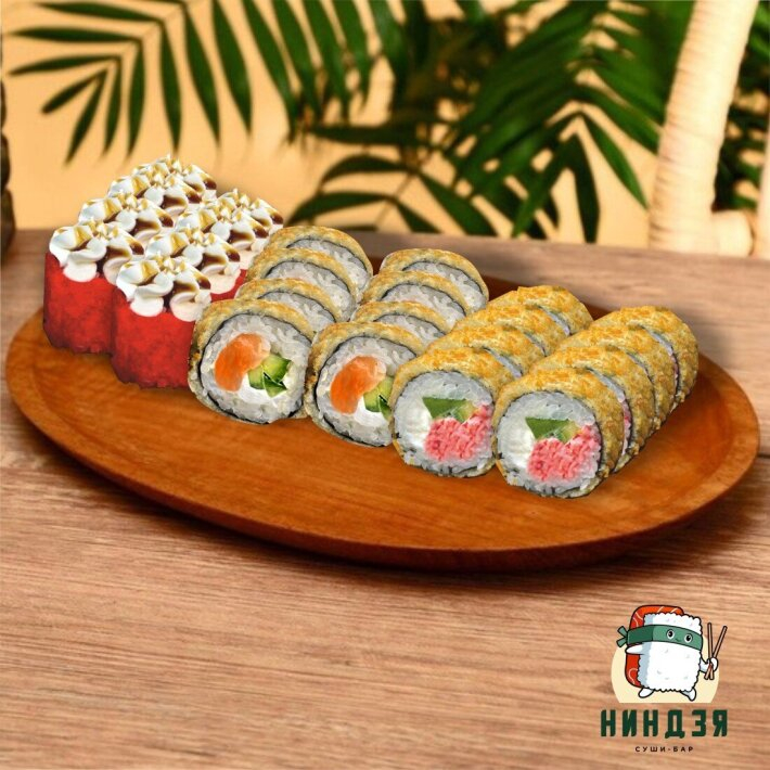 Трио: Рис, нори, сыр творожный, салат, тунец, лосось, угорь-270 гр. Филадельфия с угрем: Рис, нори, сыр творожный, огурец, лосось, угорь, кунжут, соус терияки-295 гр. Фараон: Рис, нори, сыр творожный, курица копчёная, краб, сливочно-чесночный соус, кунжут-белый, соус терияки, лук фри-335 гр. Цунами: Рис, нори, сыр творожный, огурец, сырный соус, кунжут, соус терияки, мидии-330 гр. Мидия хот: Рис, нори, сыр творожный, томат, сухари, мидия, темпура, масаго-290 гр. Чикен хот: Рис , нори, сыр творожный, курица копчёная, авокадо, темпура, сухари-280 гр. Туна хот: Рис, нори, сыр творожный, тунец, томат, темпура, сухари-280 гр.