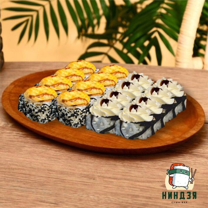 Заказать Ямайка: Рис, нори, сыр творожный, такуан, стружка нори, соус терияки, краб-275 гр. Ниндзя: Рис, нори, сыр творожный, краб, сливочно-чесночный соус, соус терияки, кунжут чёрно-белый, лук фри-305 гр.