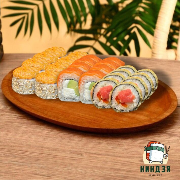 Филадельфия Тай: Рис, нори, сыр творожный, огурец, лосось-240 гр. Калифорния крабовый микс: Рис, нори, сыр творожный, огурец, краб, масого оранжевая-270 гр. Лава с лососем: Рис, нори, сыр творожный, лосось, огурец, нори стружка-270 гр. Сердце самурая: Рис, нори, сыр творожный, бекон, помидор, спайси соус, кунжут чёрно-белый-320 гр. Ниндзя: Рис, нори, сыр творожный, краб, сливочно-чесночный соус, соус терияке, кунжут чёрно-белый, лук фри-305 гр. Чикен хот: Рис, нори, сыр творожный, курица копчёная, авокадо, темпура, сухари-280 гр. Туна хот: Рис, нори, сыр творожный, тунец, томат, темпура, сухари-280 гр. Калифорния хот: Рис, нори, краб, сыр творожный, огурец, темпура, сухари-290 гр.