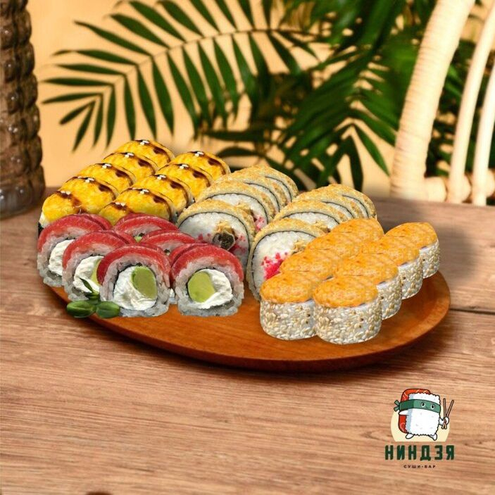 Ролл Филадельфия Тай: рис, нори, сыр творожный, огурец, лосось - 8шт; ролл Чикен-хот: рис, нори, сыр творожный, курица копчёная, салат, темпура, сухари - 8шт; ролл Ниндзя: рис, нори, сыр творожный, краб, сливочно-чесночный соус, соус терияки, кунжут чёрно-белый, лук фри - 8шт; ролл Гриль тунец: рис, нори, сыр творожный, тунец, томат, сырная шапочка, терияке, кунжут - 8шт.