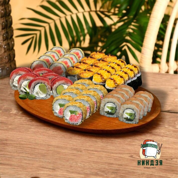 Ролл Филадельфия Тай: рис, нори, сыр творожный, огурец, лосось - 8шт; ролл Чикен-хот: рис, нори, сыр творожный, курица копчёная, салат, темпура, сухари - 8шт; ролл Ниндзя: рис, нори, сыр творожный, краб, сливочно-чесночный соус, соус терияки, кунжут чёрно-белый, лук фри - 8шт; ролл Гриль тунец: рис, нори, сыр творожный, тунец, томат, сырная шапочка, терияке, кунжут - 8шт.