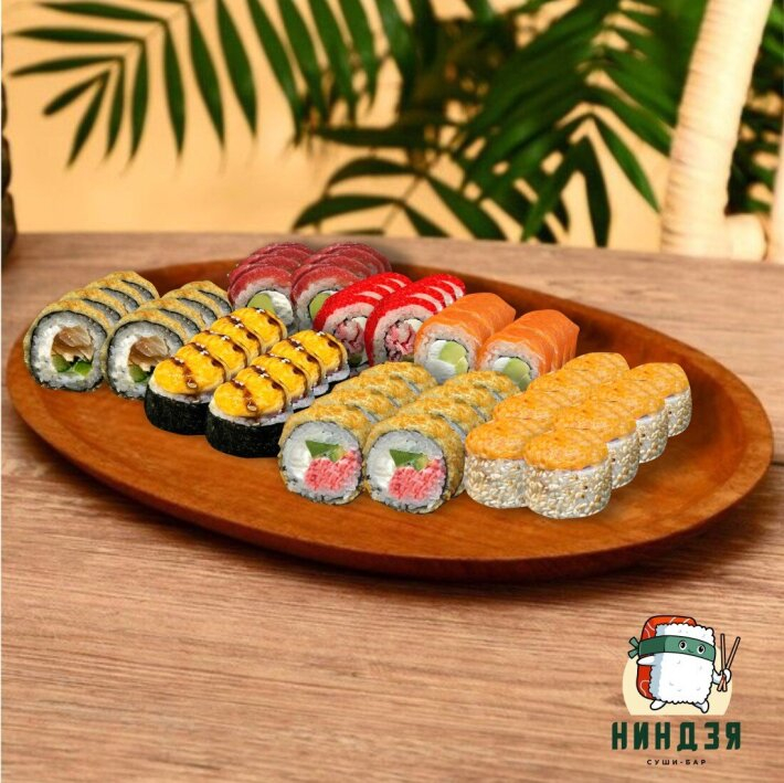 Ролл Сердце самурая - 320г, ролл Ниндзя - 305г, ролл Запеченный с лососем - 290г, ролл Морской бриз - 330г.