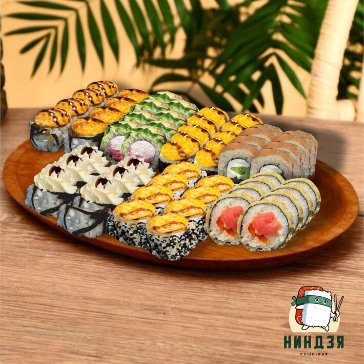 Заказать Ролл Сердце самурая - 320г, ролл Ниндзя - 305г, ролл Запеченный с лососем - 290г, ролл Морской бриз - 330г.