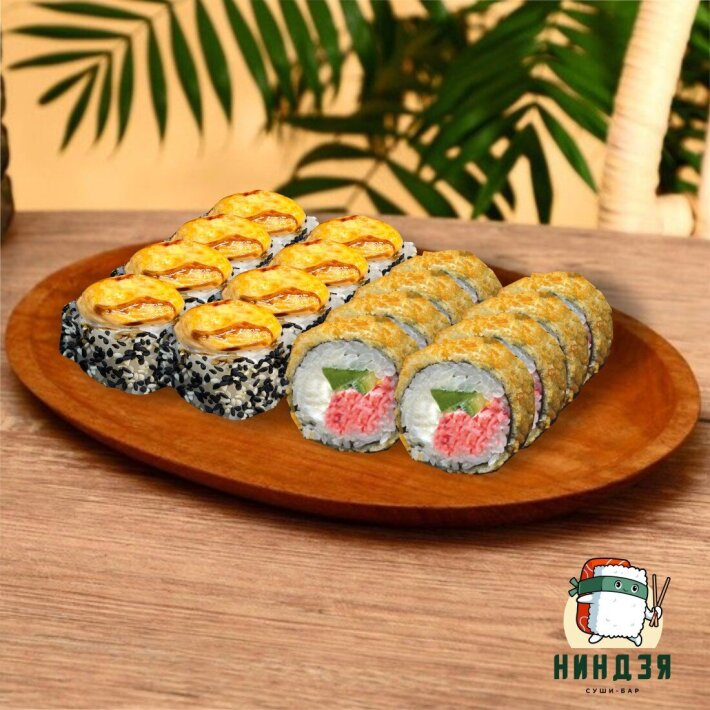 Заказать Калифорния хот: Рис, нори, краб, сыр творожный, огурец, темпура, сухари - 280 гр. Мантра: Рис, нори, огурец, кальмар, сыр творожный, кунжут, сливочно-чесночный соус, соус терияки- 330 гр.