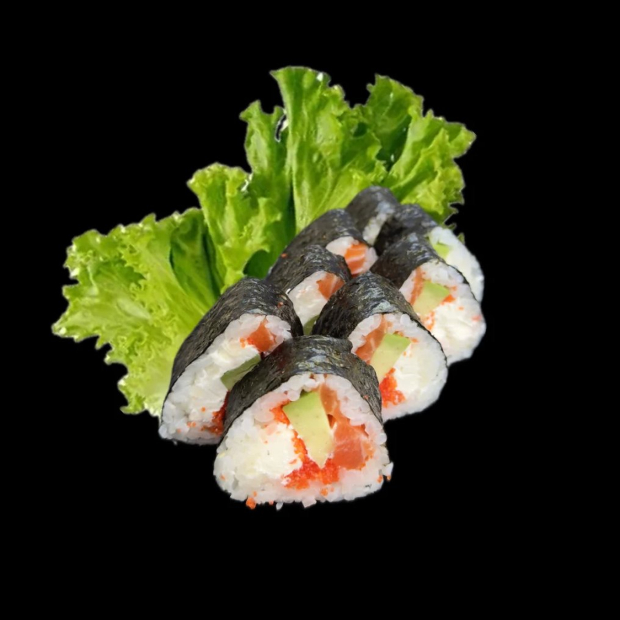 Рис, нори, лосось, авокадо, масаго, сыр творожный.