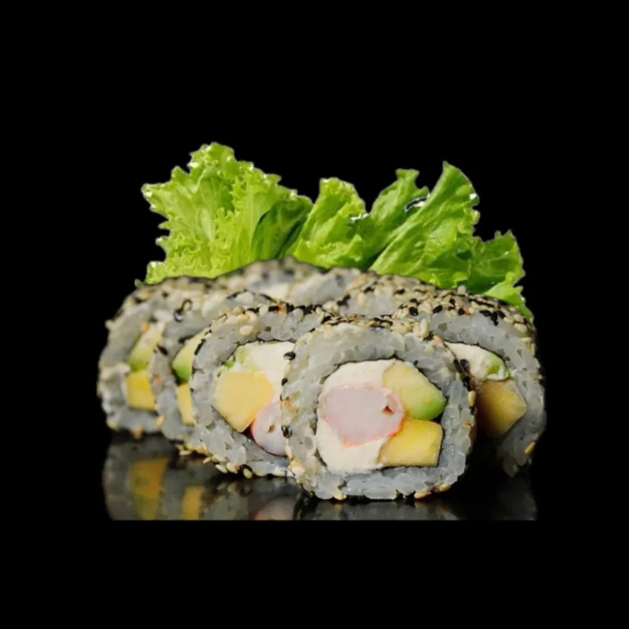 Рис, нори, сыр творожный, креветка, авокадо, ананас, кунжут.