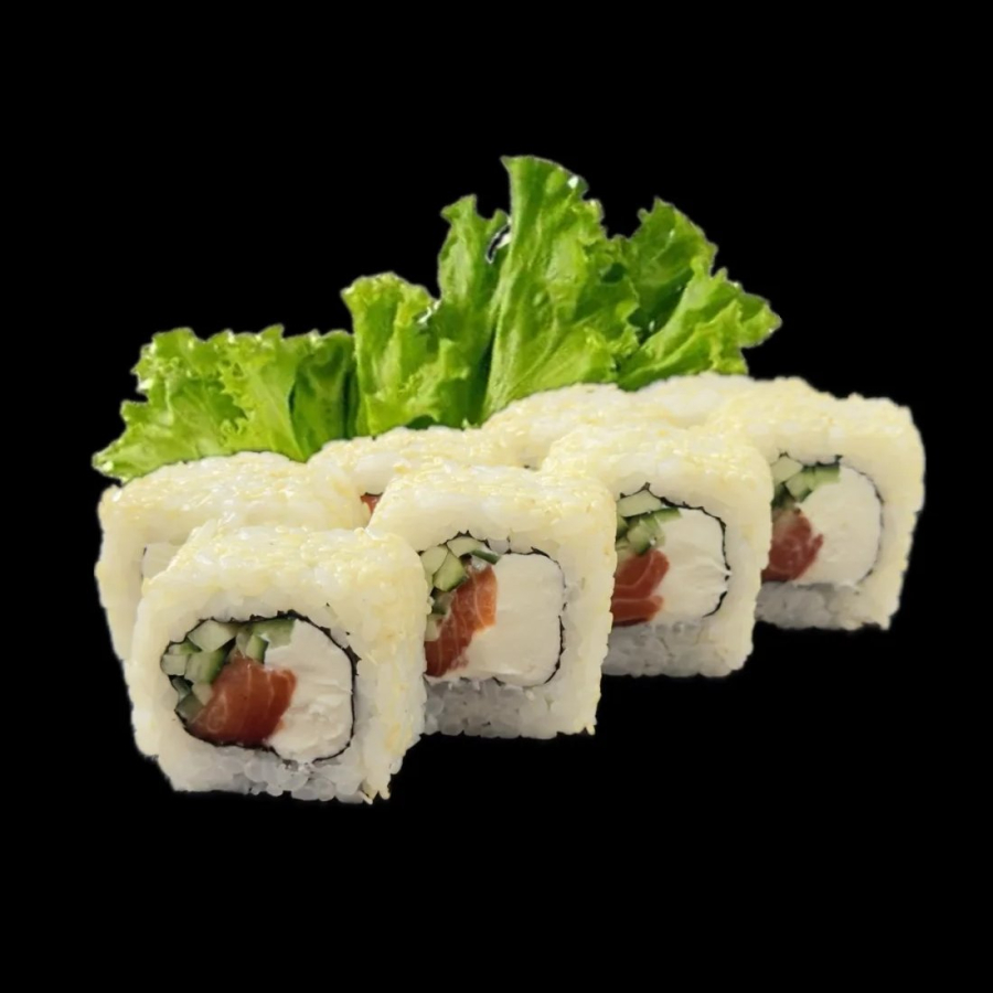 Рис, нори, сыр творожный, лосось, огурец, кунжут.