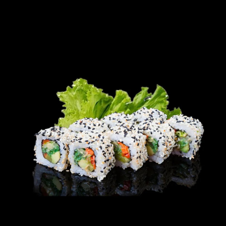 Рис, нори, лосось, авокадо, чука, такуан, кунжут.