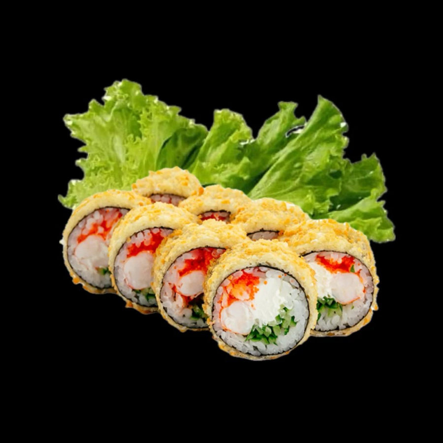 Рис, нори, креветка, икра масаго, сыр творожный, огурец, темпура, сухари панко.